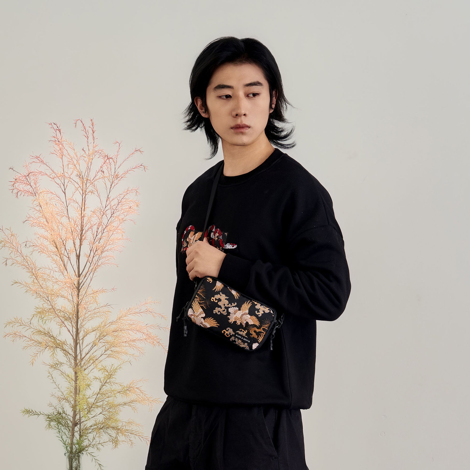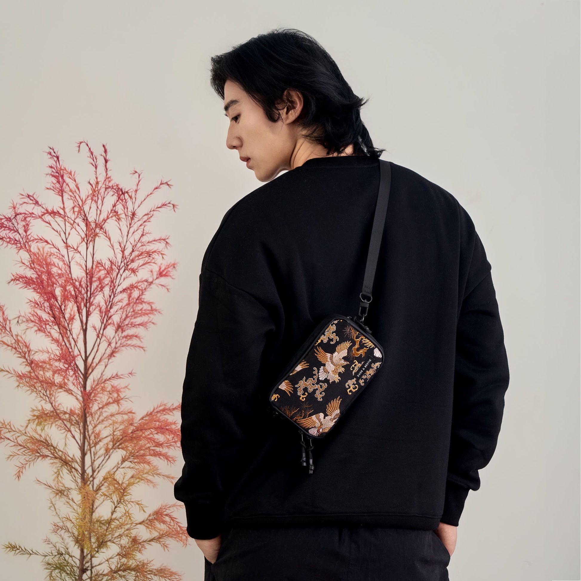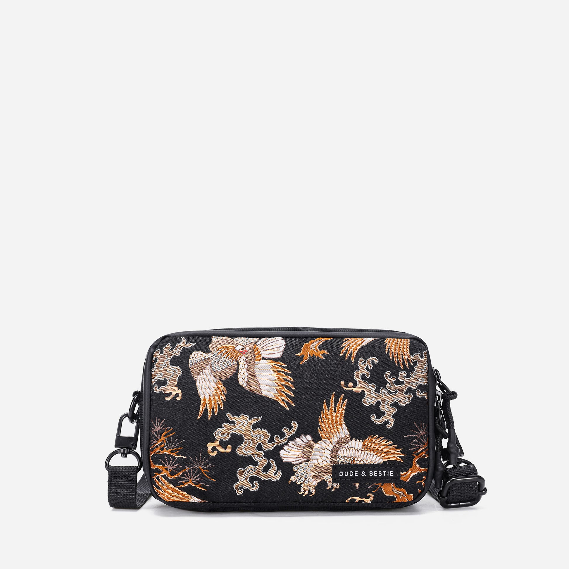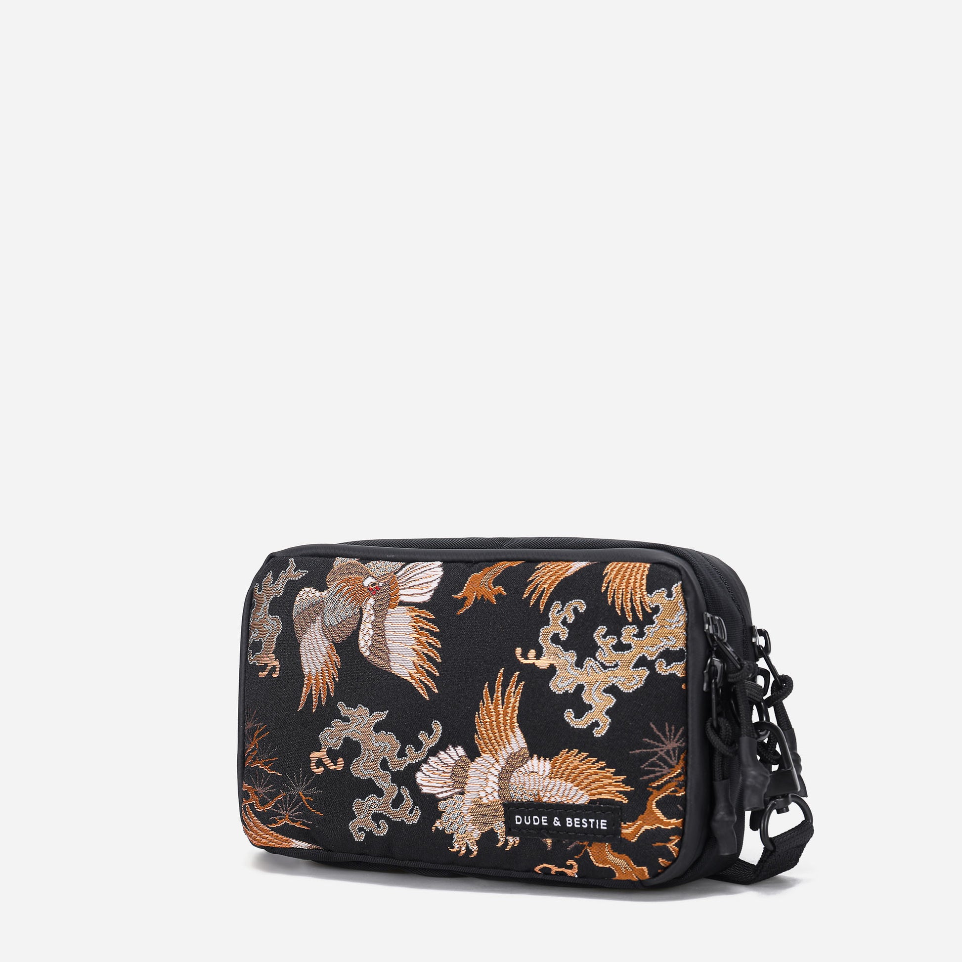 Crafted with traditional Japanese Nishijin-ori fabric from Kyoto, this sophisticated crossbody bag features the iconic "Matsu-Taka" (Pine and Eagle) motif, symbolizing prosperity and longevity. Designed for both style and functionality, its sleek silhouette and thoughtful compartments make it a versatile companion for daily adventures or special occasions. Embrace the timeless artistry of Japanese craftsmanship while enjoying the convenience of a modern, practical design.