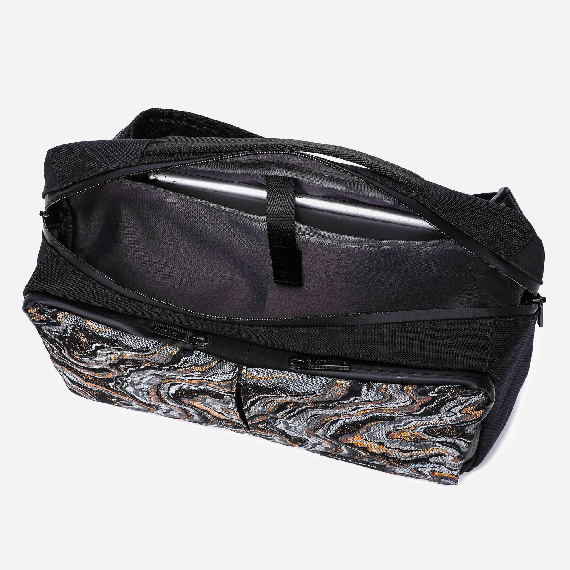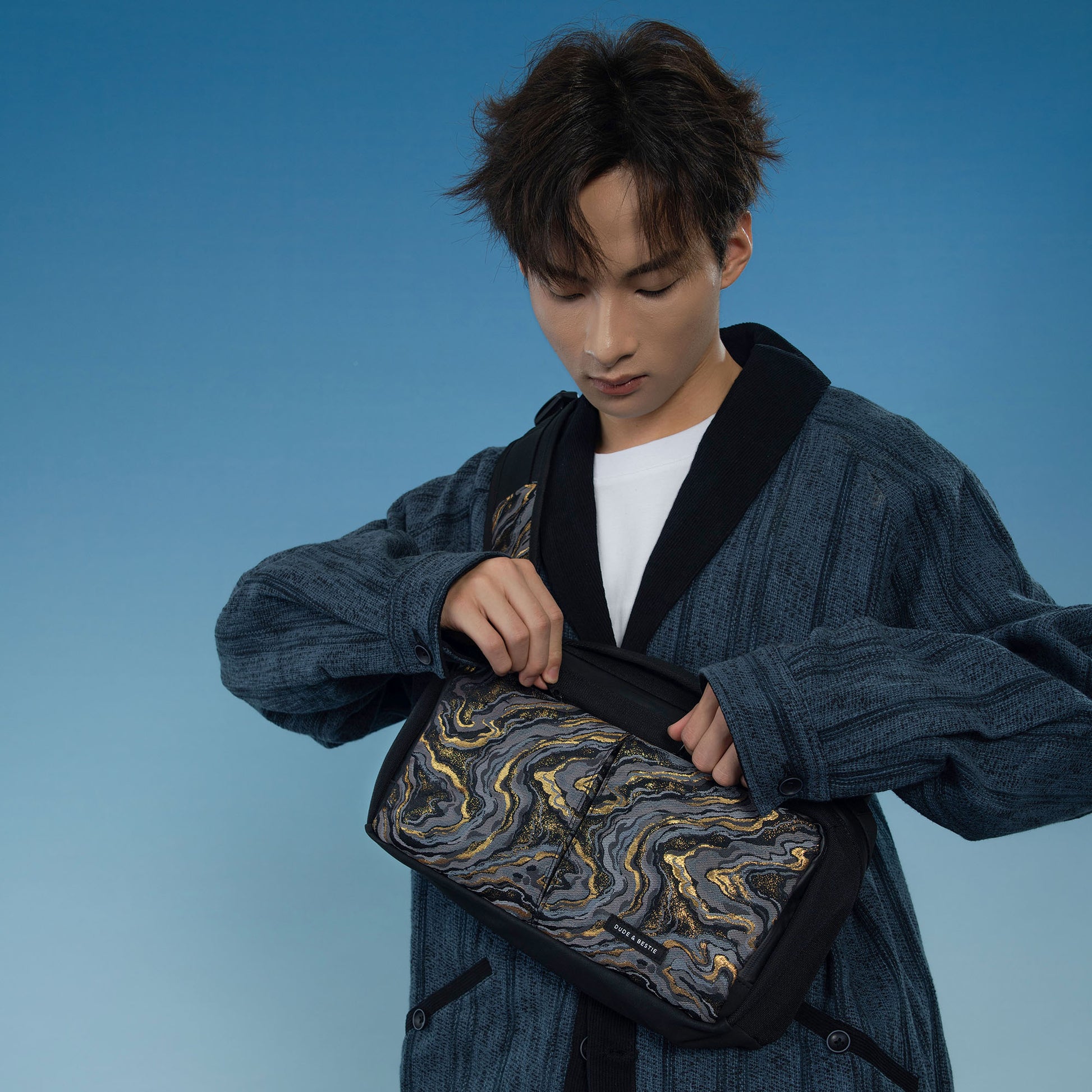 This limited edition crossbody bag combines functionality with luxury, featuring an exquisite front panel made from traditional Japanese Nishijin-ori fabric. Designed to fit an 11-inch tablet, this bag is crafted with water-resistant nylon for added durability. The unique blend of modern materials and timeless craftsmanship makes it a standout accessory for any collection.