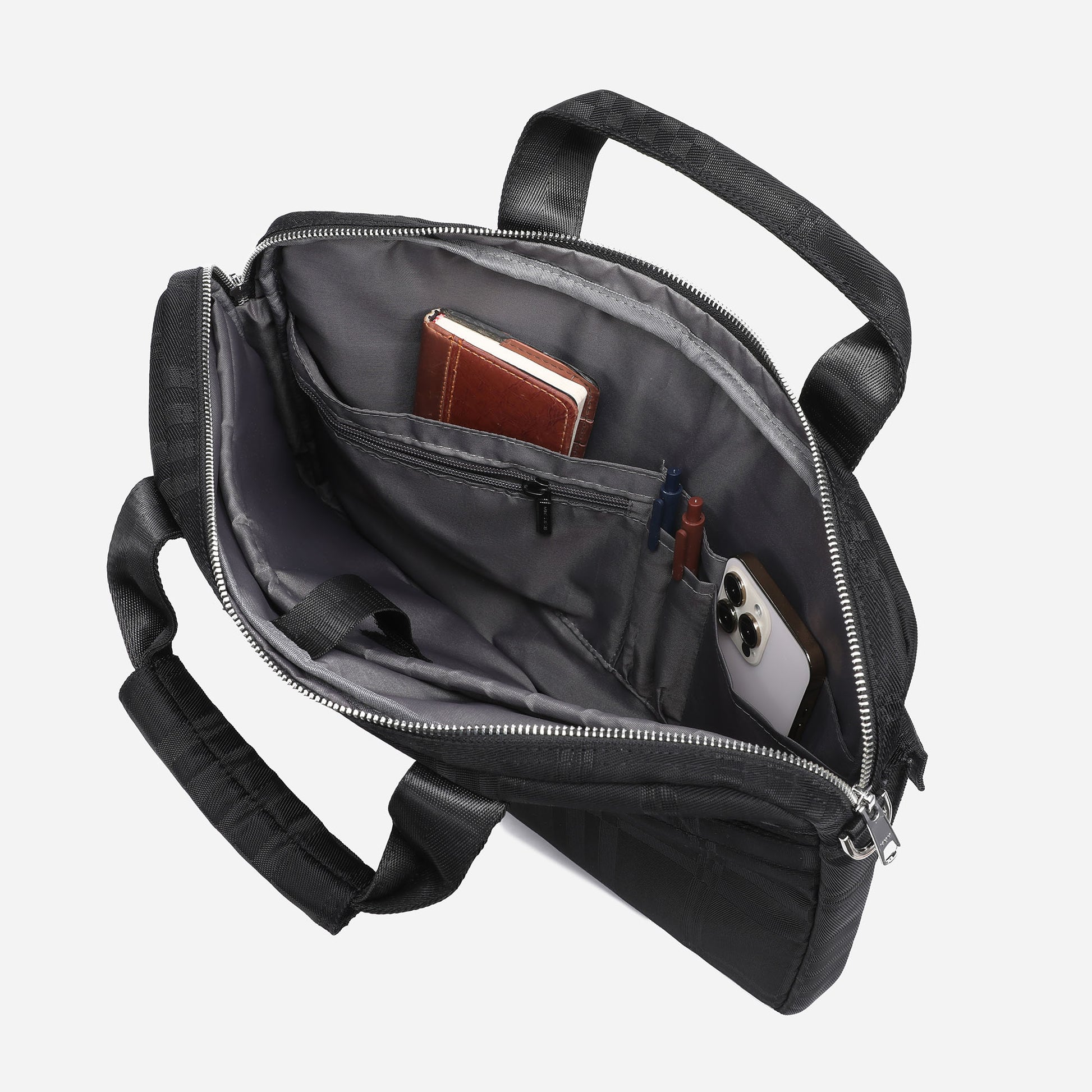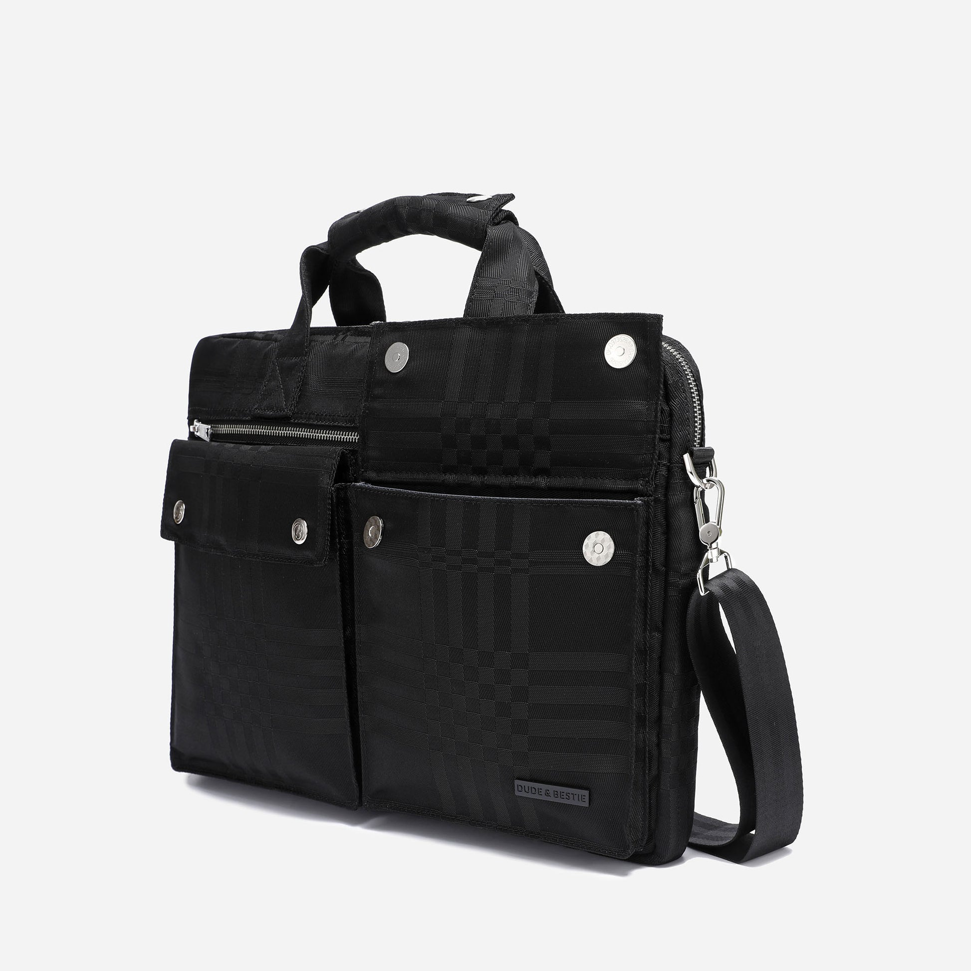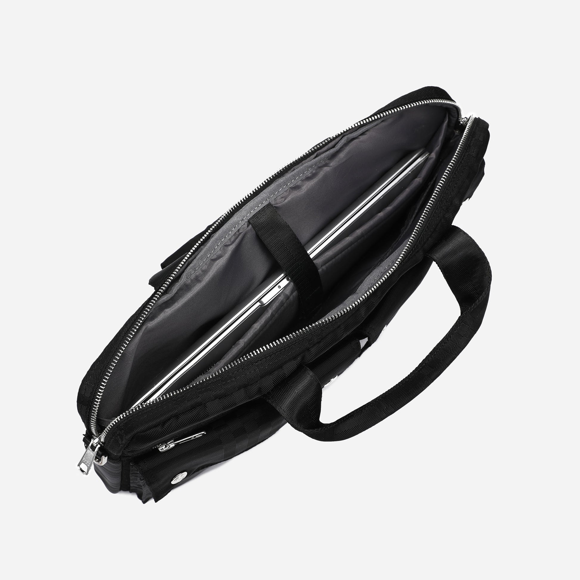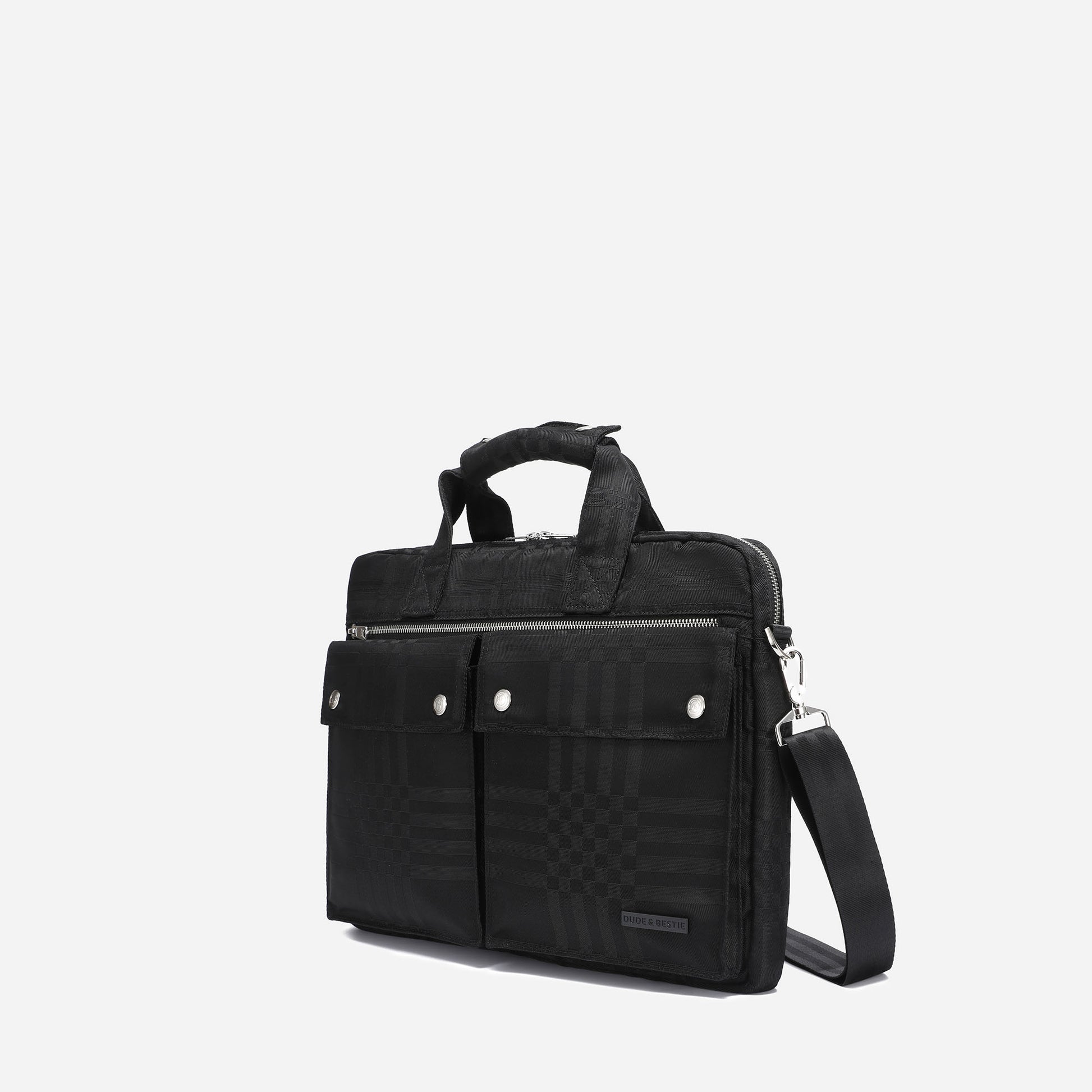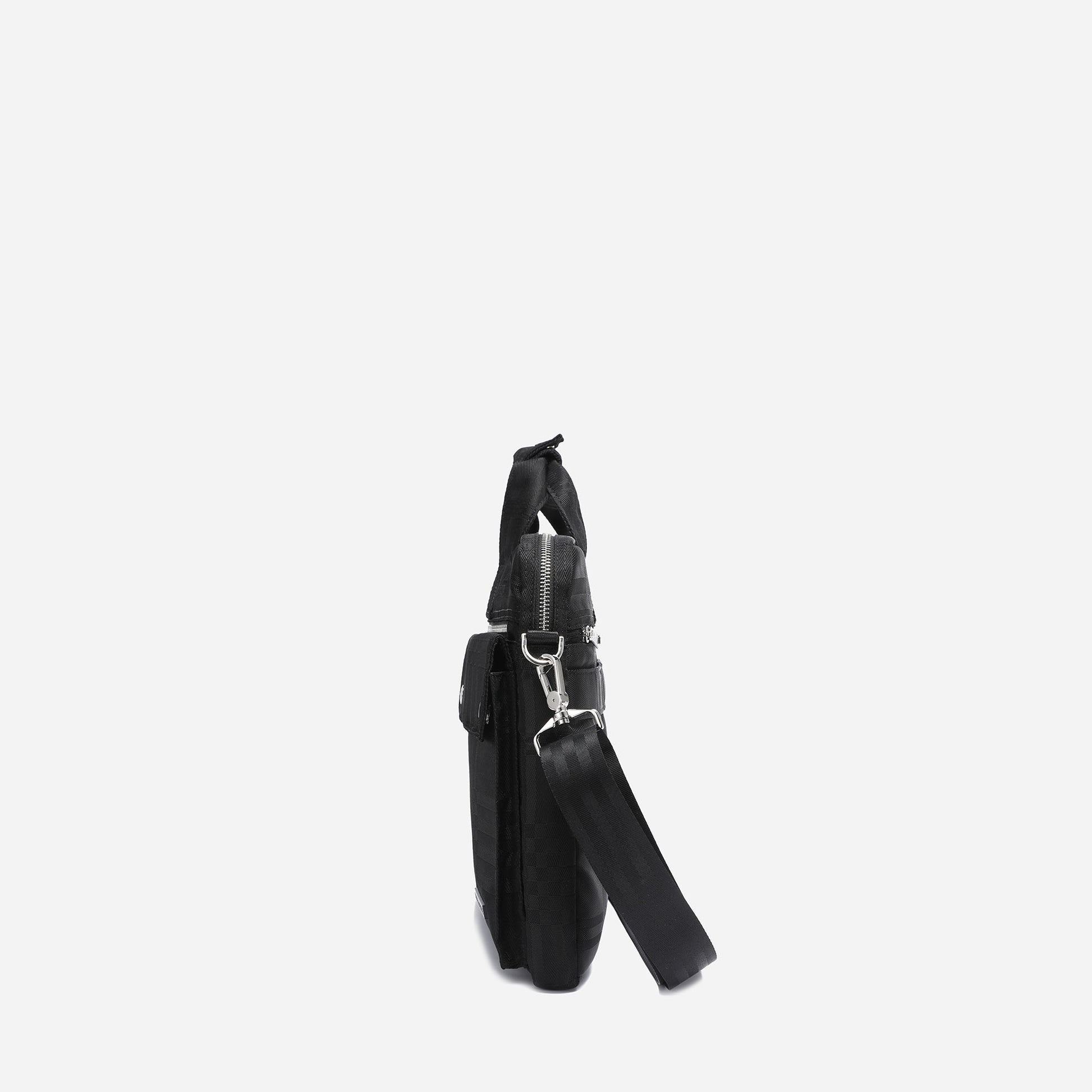 Stay organized and stylish with this black nylon briefcase. Made with durable and lightweight material, it features a secure YKK zipper closure, multiple pockets, and an adjustable shoulder strap. Its sleek design with silver hardware and black-tone tartan pattern adds elegance, making it perfect for any formal or business setting.