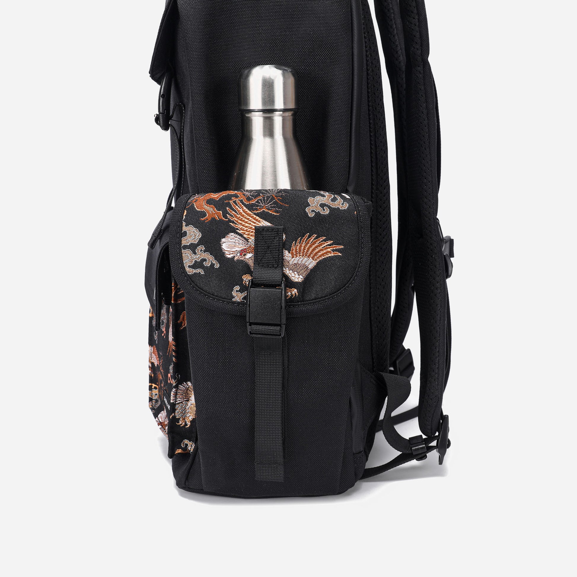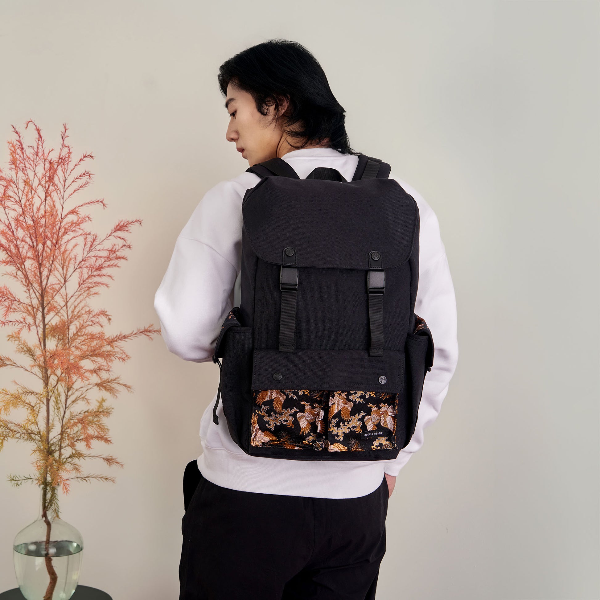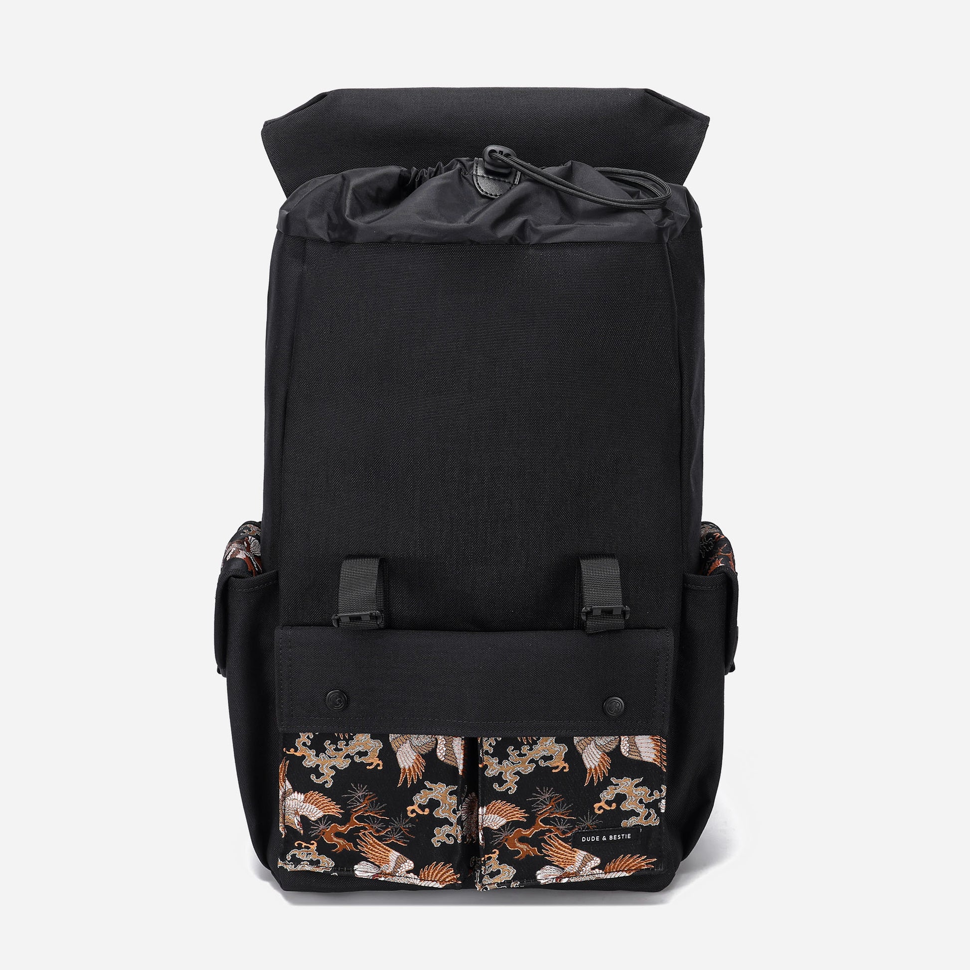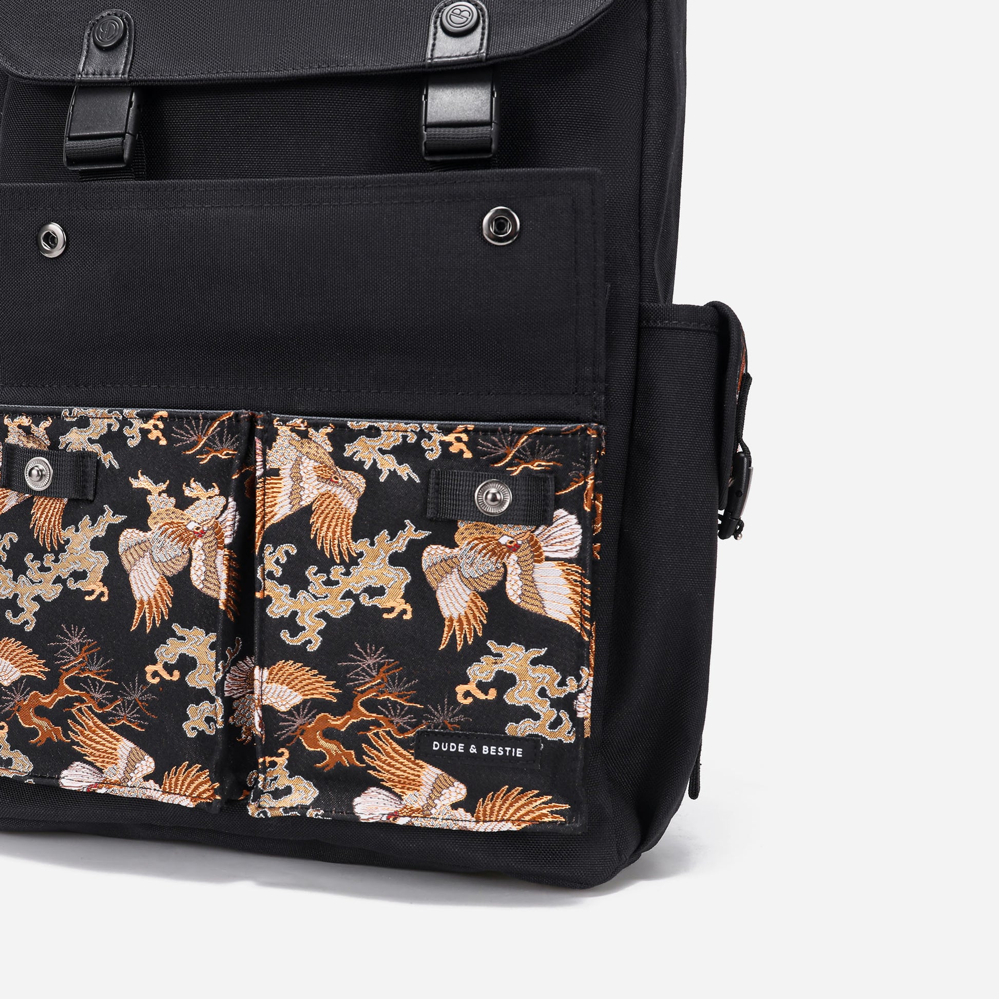 Crafted with traditional Japanese Nishijin-ori fabric from Kyoto, this exquisite backpack features a striking "Matsu-Taka" (Pine and Eagle) motif. Representing prosperity and longevity, the intricate design seamlessly merges the classic elegance of Japanese craftsmanship with modern practicality. Perfectly balancing style and functionality, this backpack is a timeless choice for those who appreciate meaningful artistry and superior utility.