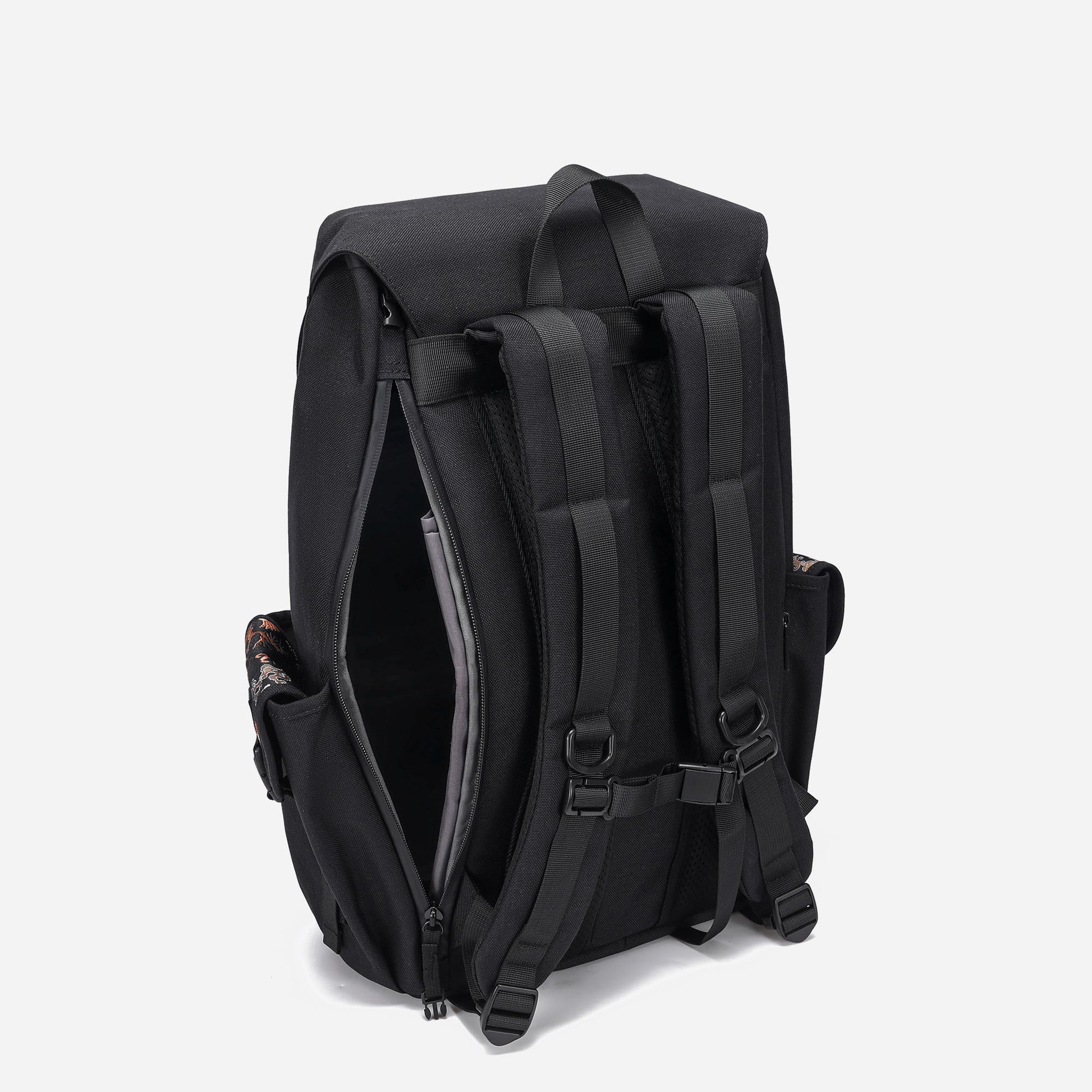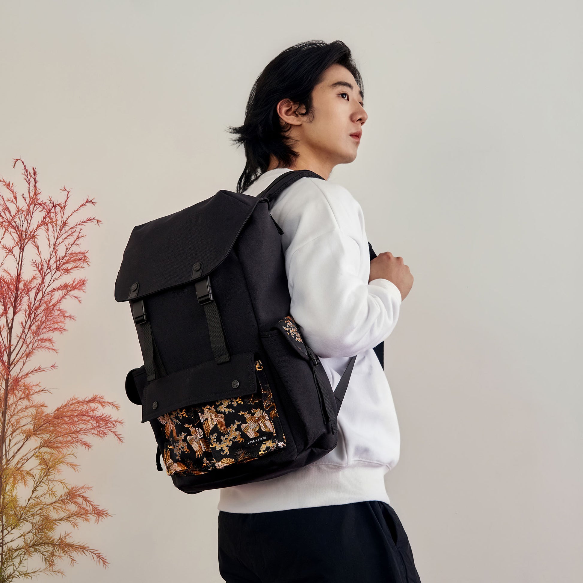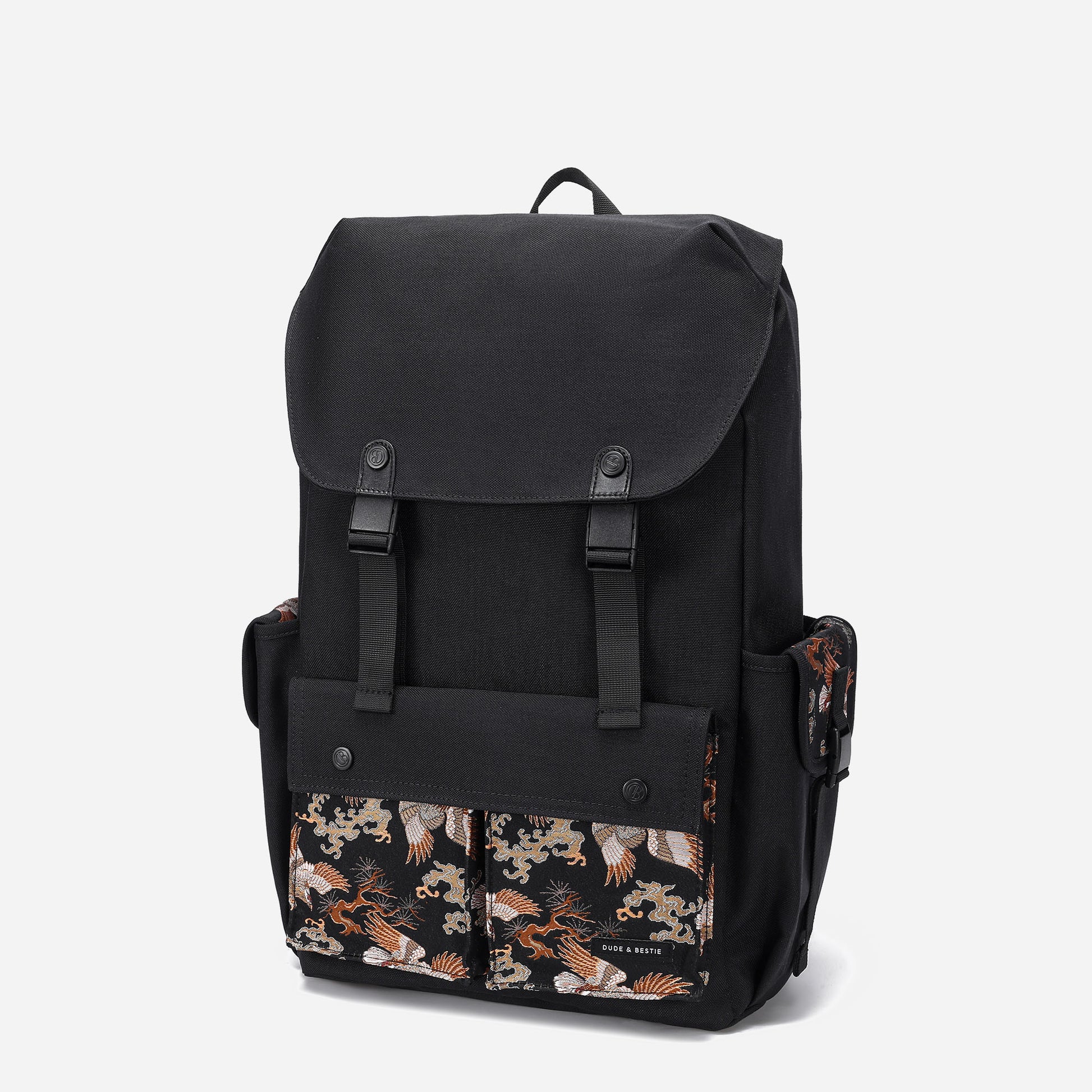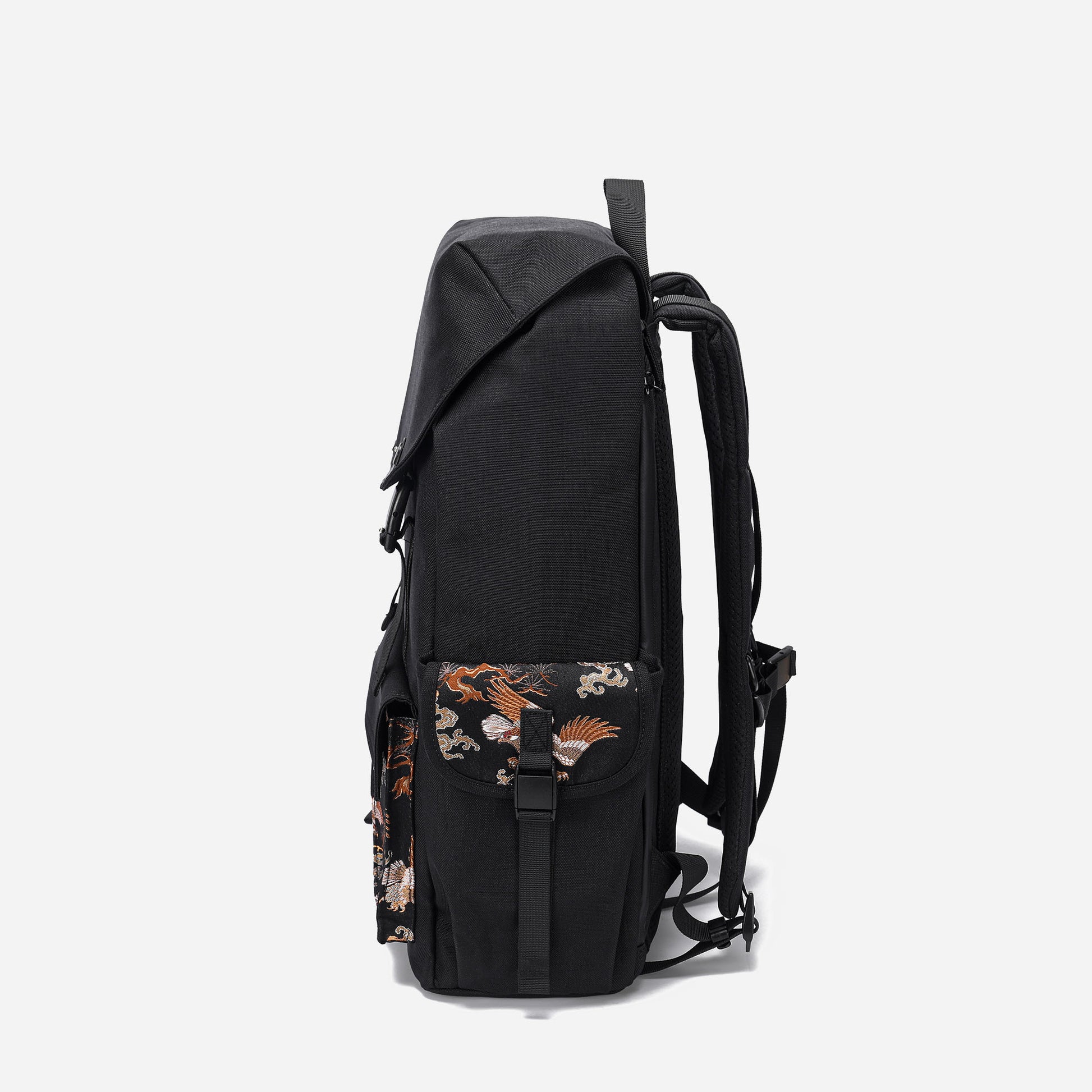 Crafted with traditional Japanese Nishijin-ori fabric from Kyoto, this exquisite backpack features a striking "Matsu-Taka" (Pine and Eagle) motif. Representing prosperity and longevity, the intricate design seamlessly merges the classic elegance of Japanese craftsmanship with modern practicality. Perfectly balancing style and functionality, this backpack is a timeless choice for those who appreciate meaningful artistry and superior utility.