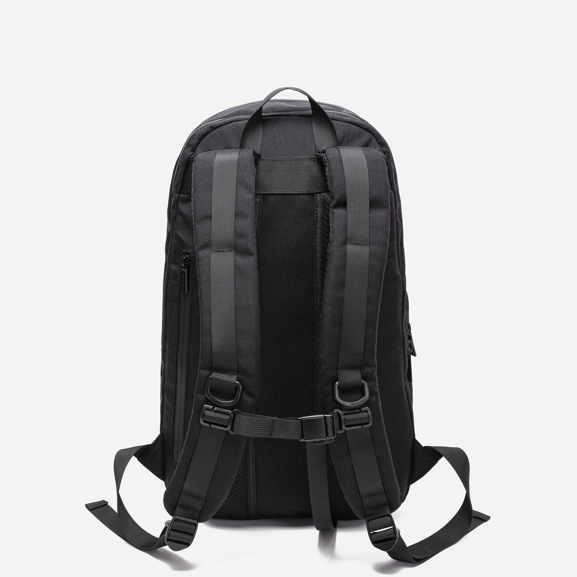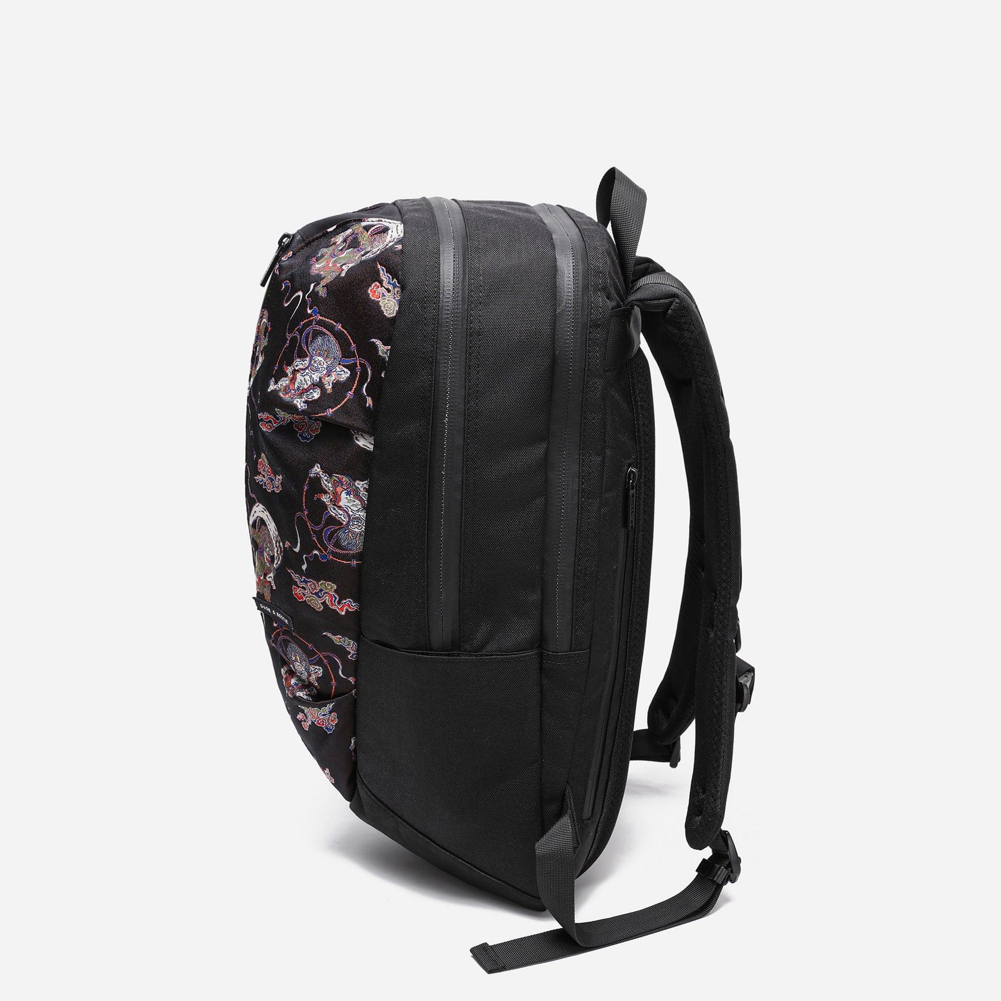 The Skater boasts a structured and clean-lined design, constructed from 1000D water-repellent nylon. Its front pocket features a large area of "Fujin & Raijin" Nishijin-ori, with vibrant patterns and copper threads standing out against deep black, imbuing the piece with an understated luxury aesthetic.