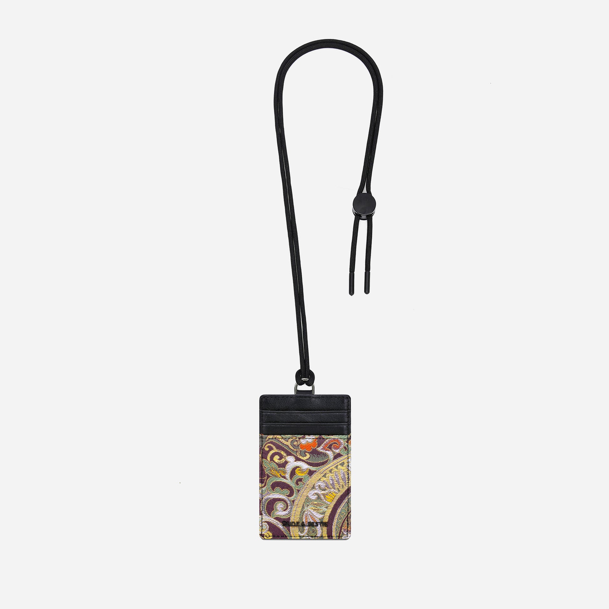 This Vertical Card Holder is crafted from luxurious Japanese Nishijin-ori and black-grained calfskin for a fashionable and functional look. With three card slots and a transparent badge window, you can easily organize and store your ID and credit cards. The adjustable and removable shoulder strap makes it comfortable to wear around your neck or hook to a bag.